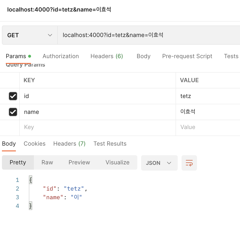 다만 params의 약점은 정의된 형태로만 데이터를 받을 수 있으므로 이러한 제한이 없게끔 해주는 방법은 req.query 를 사용하는 것이다.