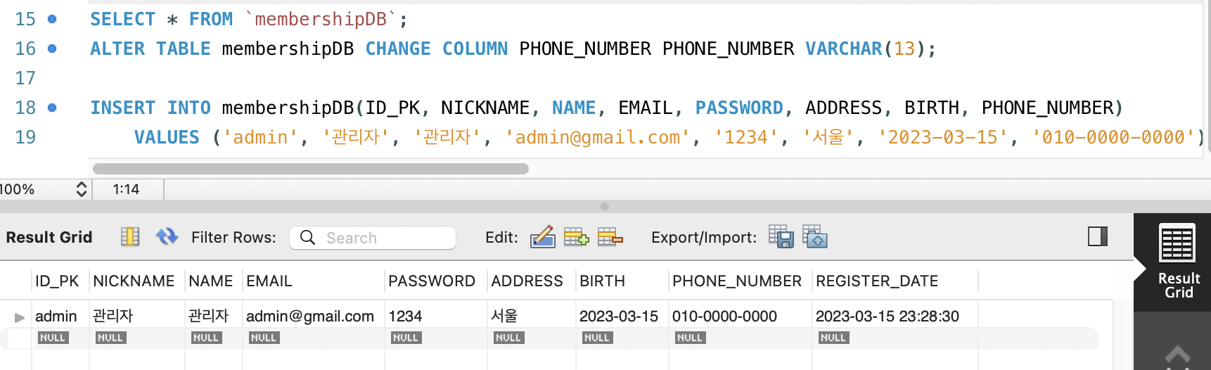 호기롭게 테이블을 만들었으나 전화번호를 숫자로 받아버린 탓에 테이블의 열 자료형을 변경해줘야 했다.