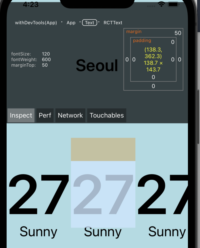 m 을 누르면(스마트폰의 경우 흔들면) 개발자 메뉴가 뜨는데 그중 show element inspector 는 브라우저에서 개발자 도구의 element 탭과 동일하다고 생각하면 된다.
