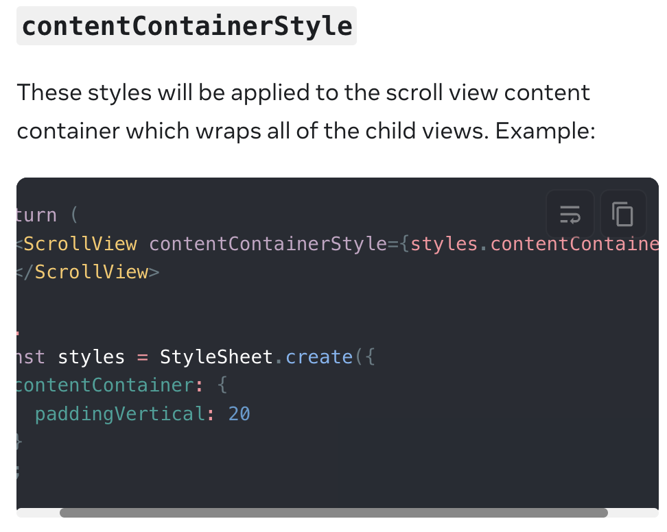 contentContainerStyle 속성은 style 과 달리 flex 사이즈를 줄 필요가 없기 때문에(당연히 스크롤이 되는 부분은 원래 컨텐츠 크기보다 커야하므로) flex 사이즈를 주지 않는다. 주면 스크롤이 이상한 곳에서 끊기게 된다.