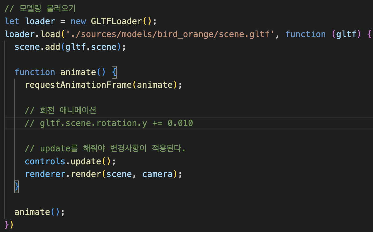 저번에 gltf 모델의 scene 에 rotation.y 값을 주어 빙글빙글 돌리는 애니메이션을 구현했었다.