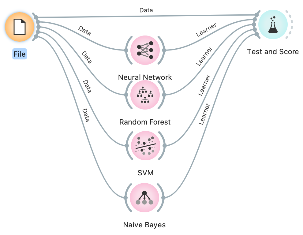 -> 각 모델들에 File -> 모델 -> Test and Score 을 연결시켜준다
