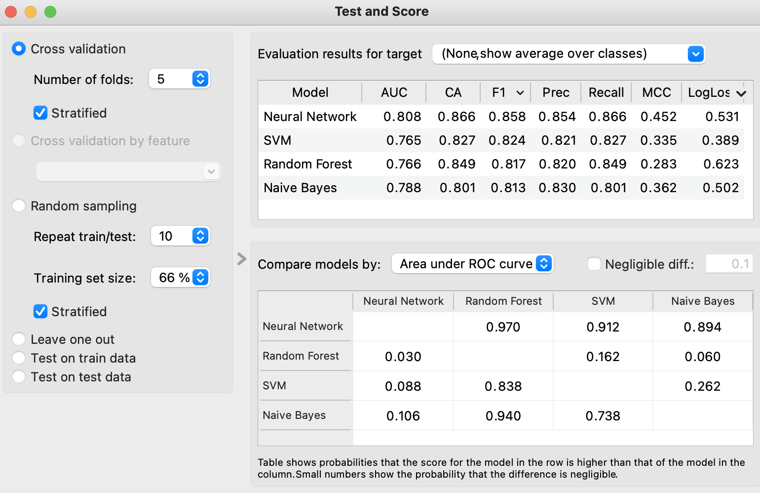 -> 잠시 Running 후 Test and Score 를 더블클릭하여 모델의 테스트 결과(성능)를 확인한다