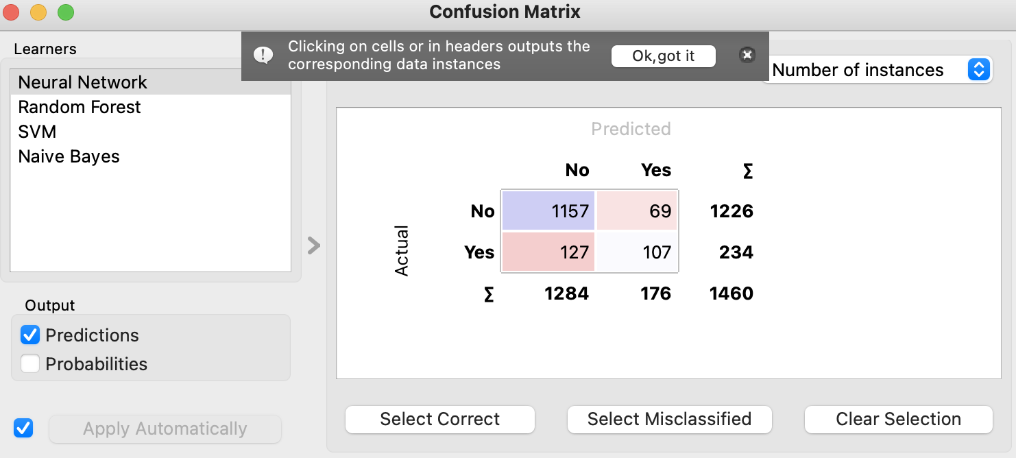 F1 탭 부분을 종합평가로 높은 순서로 보면 신경망이 86.6% 확률로 이직할 직원을 예측한다는 것을 추정할 수 있다.