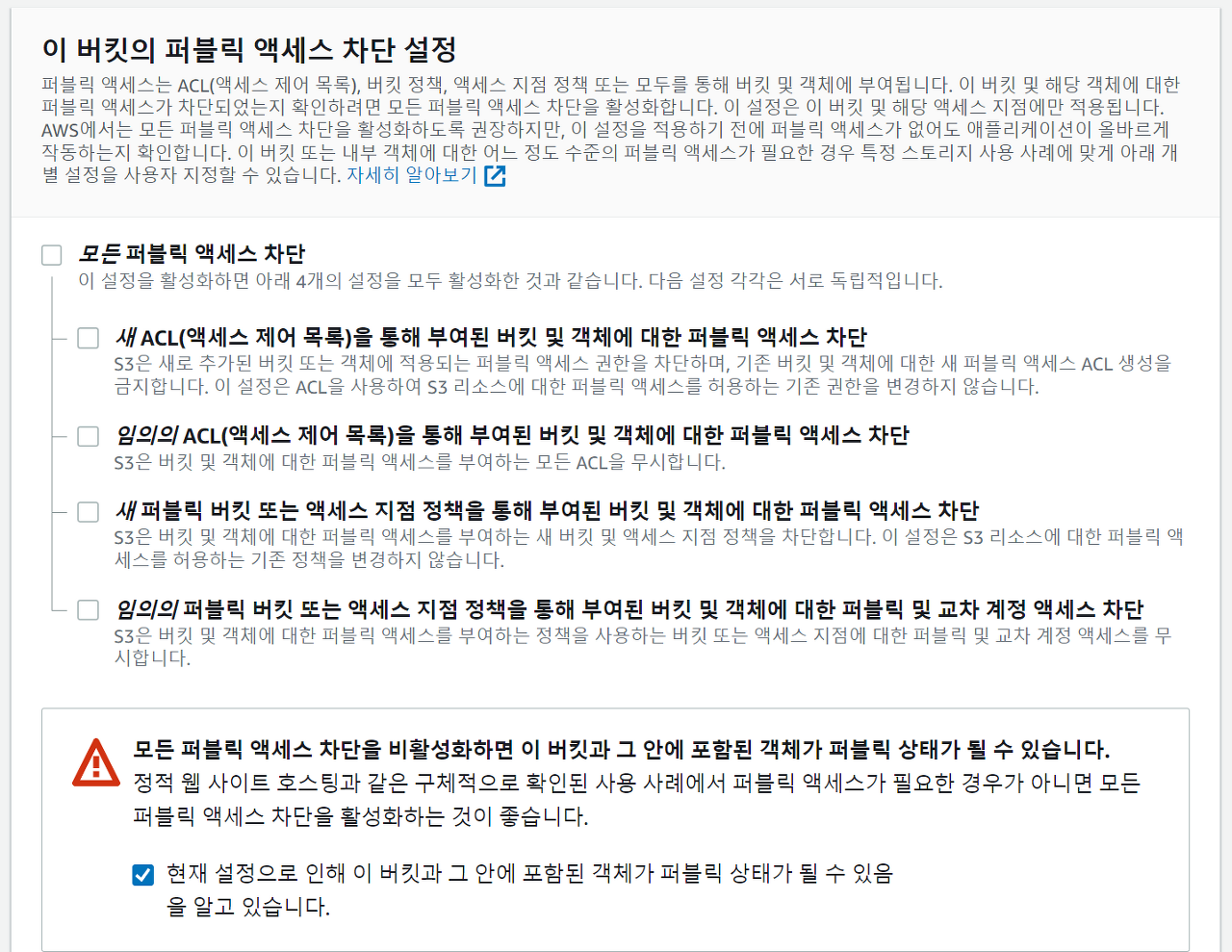 - 버킷의 퍼블릭 액세스 차단 설정은 개발 시에는 아래처럼