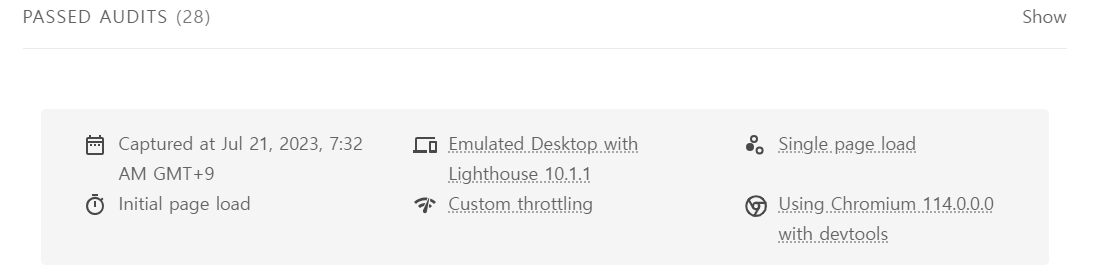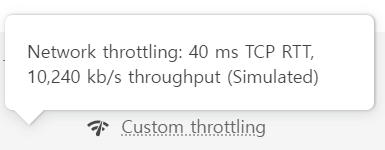 - Network throttling이라는 정보를 확인할 수 있으며, 이는 네트워크 속도를 제한하여 어느 정도 고정된 네트워크 환경에서 성능을 측정했다는 의미