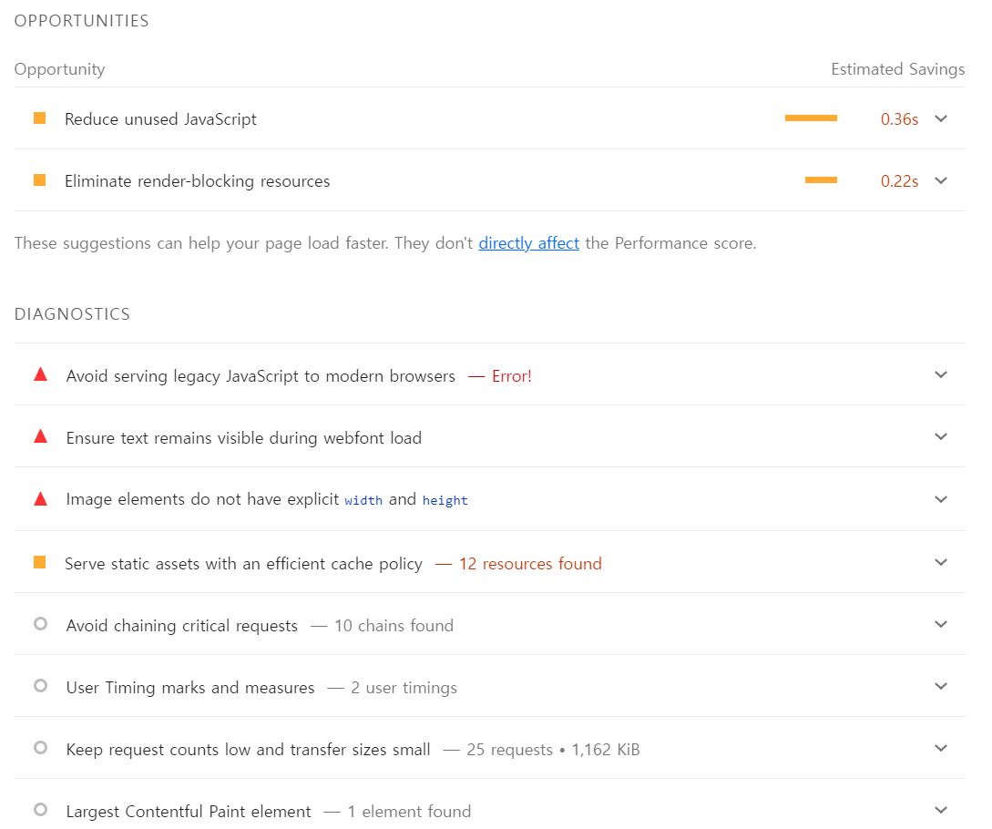 Serve static assets with an efficient cache policy 캐시 써라 Reduce JS execution time 실행시간 감소하라