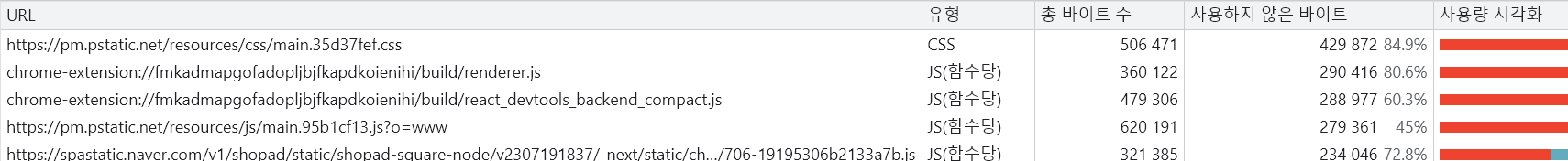 웹 페이지를 렌더링 하는 과정에서 어떤 코드가 실행되었는지 보여준다. 특정 파일의 코드가 극히 일부만 실행되었다면(= 퍼센트가 낮다면) 해당 파일에 불필요한 코드가 많이 포함되어 있다는 의미