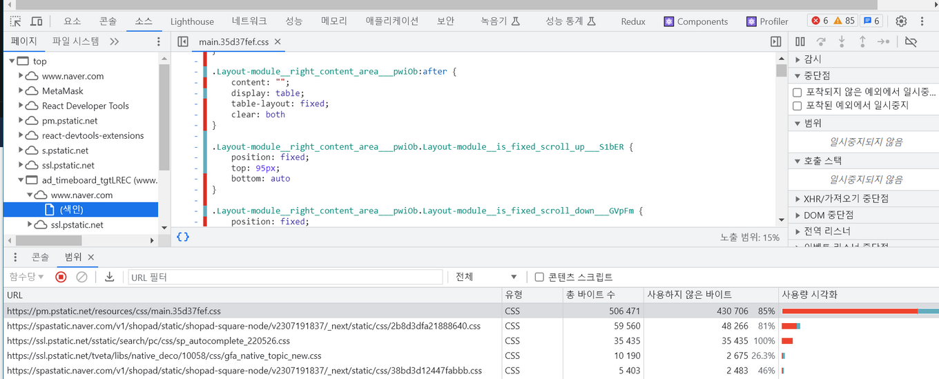 개발자 도구의 Coverage(범위) 패널을 이용하여 페이지에서 사용되는 파일의 리소스에서 실제로 실행되는 코드가 얼마나 되는지 알려주며 비율을 확인할 수 있다.
