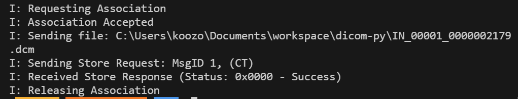 python -m pynetdicom storescu 127.0.0.1 11112 파일명.dcm -v -cx