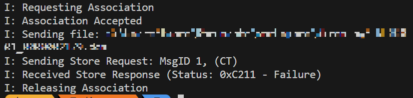 SCP를 틀어놓고 아래와 같이 명령해주면 dcm 파일을 SCP에 보내주게 된다. 아래와 같은 값을 반환한다. 확인해보면 당연하게도 0xC211 로 Failure 가 떴다.