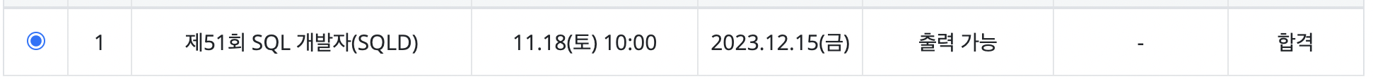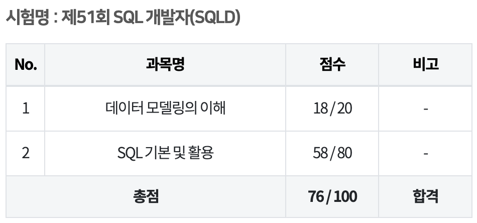 저번 11월달 시행된 SQLD 결과가 저번주에 나왔는데 다행히 합격했다.
