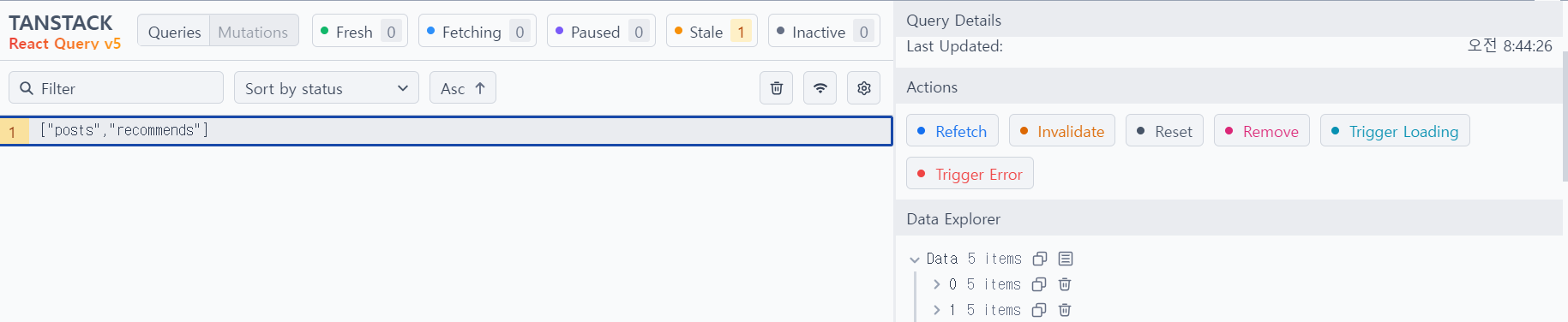 - Refetch: Last Updated 시간이 갱신됨. 즉 서버에서 정보를 다시 불러오는 것과 같음, inactive 상태와 무관하게 무조건 새로 가져옴
