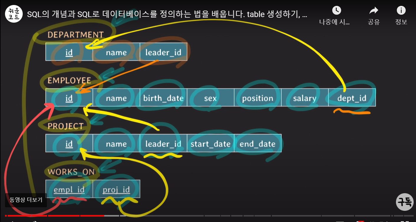부서, 사원, 프로젝트 관련 정보들을 저장할 수 있는 관계형 데이터베이스 만들기를 같이 하게된다. (MySQL)