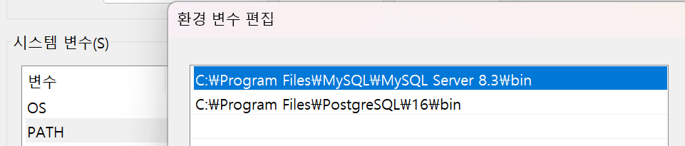 시스템 속성의 환경변수에서 PATH 부분을 ; 을 구분자로 하여 MySQL과 PostgreSQL의 bin 폴더 경로를 넣어준다. 이렇게 하지 않으면 cmd 측에서 mysql, psql 로 접근이 불가하고 매번 전용 커맨드라인 프로그램을 틀어줘야 한다. 설치시 다른걸 건드리지 않았다는 전제하에 보통 주소는 C:\Program Files 폴더 아래에 위치할 것이다.