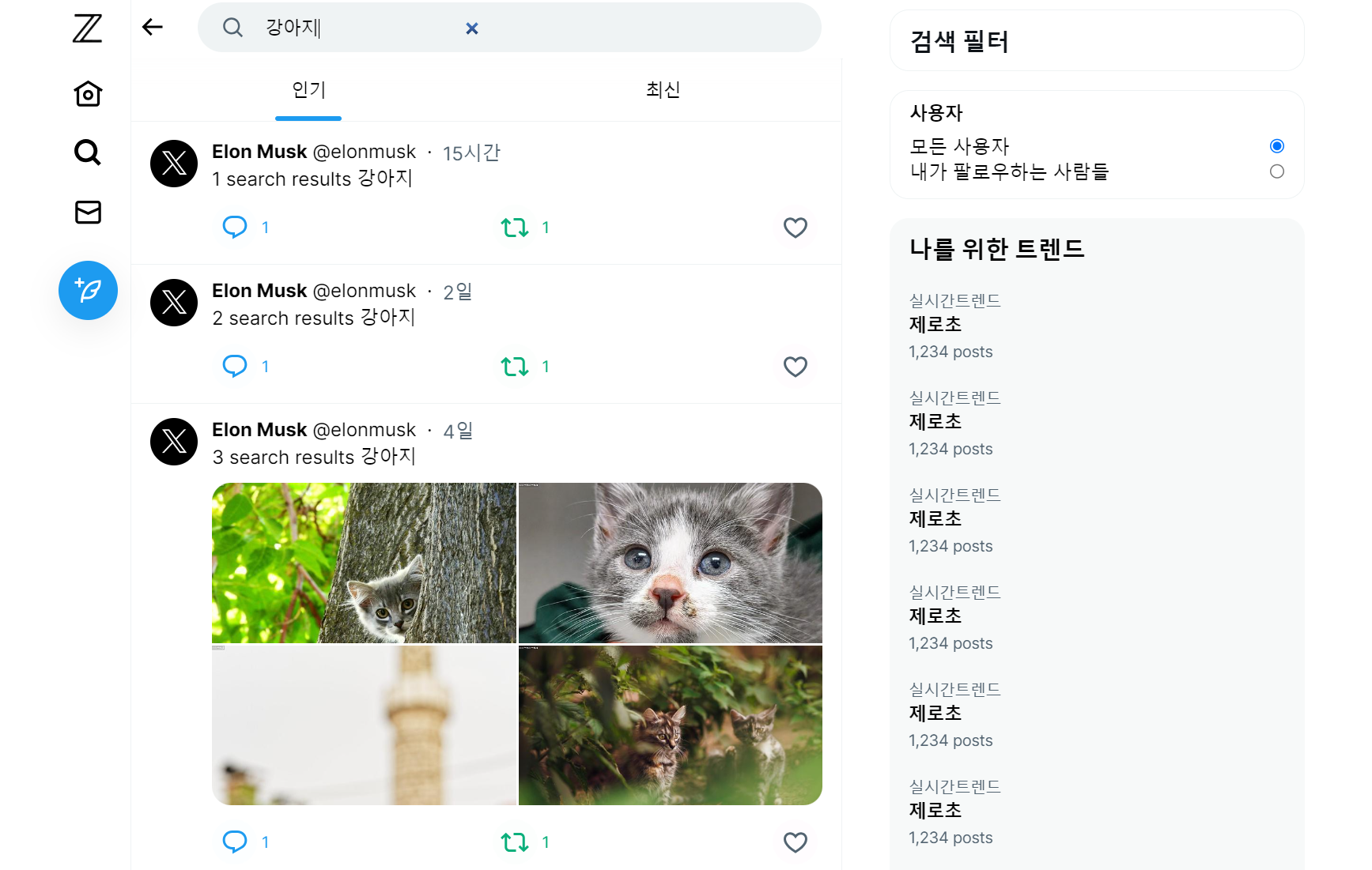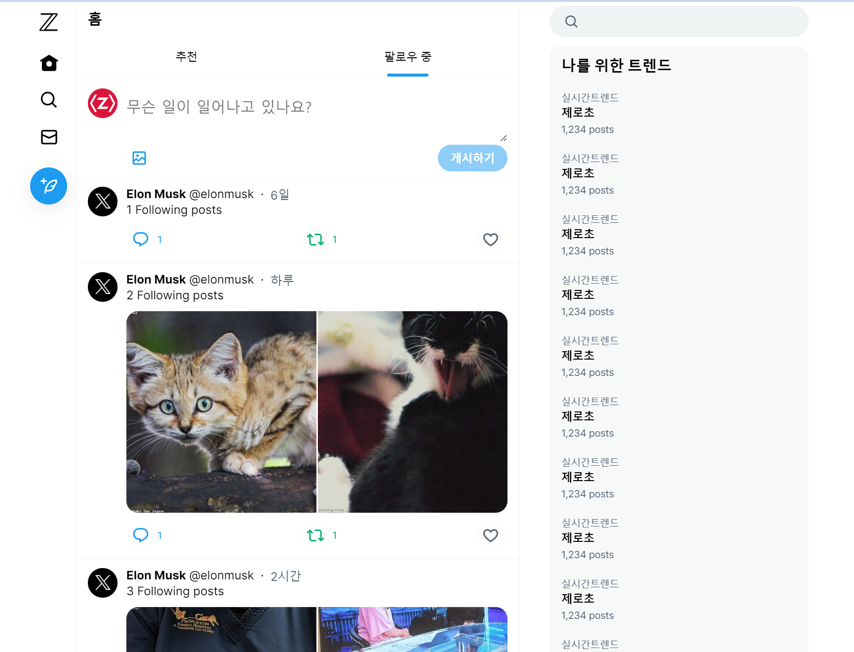 얼레벌레 트렌드 부분과 팔로우 추천 부분을 더미 데이터로 채우면 이렇게 됩니다.
