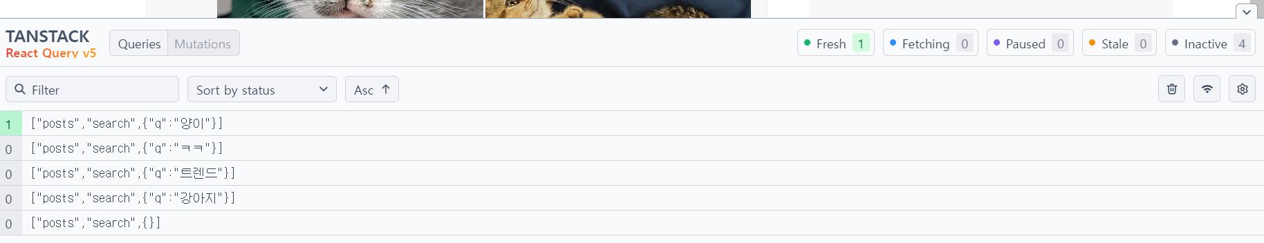 다만 검색할 때마다 관련 검색params의 결과로 아래와 같이 리액트 쿼리 캐싱에 쌓이게 됩니다. 그러므로 캐싱 시간을 짧게 하거나 특정 조건일 때 정리를 해주는 등의 메모리 관리가 별도로 필요합니다.