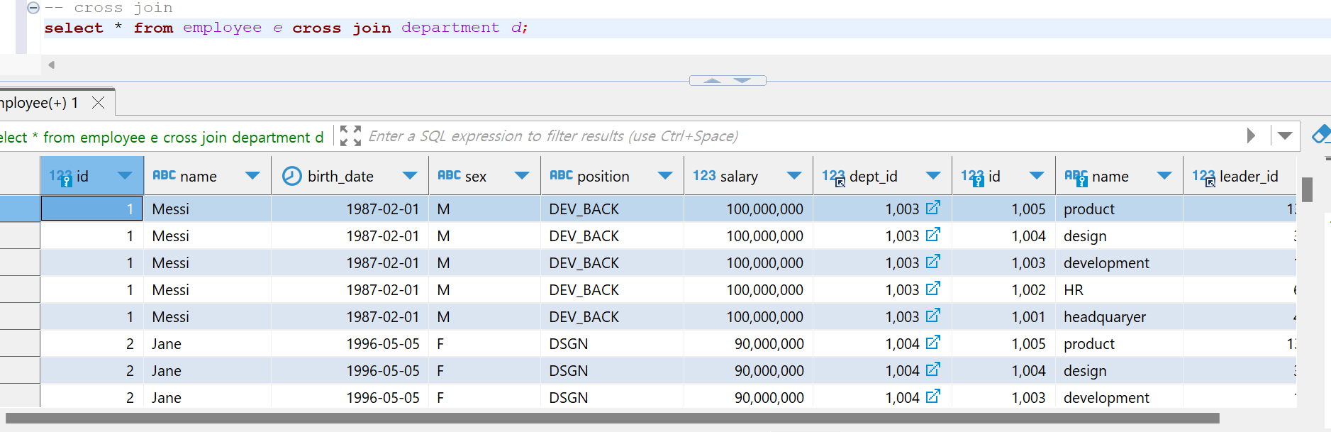 위의 예시에서 보듯이 두 테이블을 from절에서 , 로 작성하거나 table명 사이에 cross join 을 써주면 cross join이 성립한다.