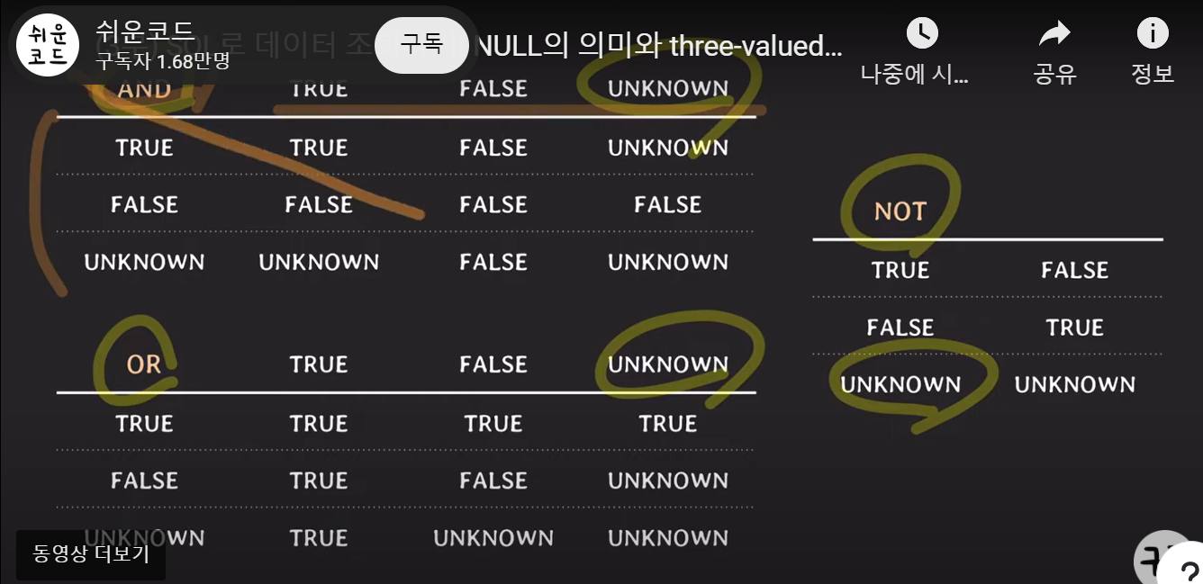 - SQL에서 Null 과 비교연산을 하게 되면 그 결과는 unknown 이 되며 이 의미는 true일수도, false 일수도 있다는 의미가 됨 -> 이를 three valued logic 이라 한다