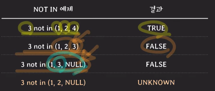 | 주의사항 | null 값이 있으면 and 연산자의 특징상 옳은 정보마저도 unknown(false) 처리가 되므로 올바른 결과를 도출할 수 없게 됨 -> is not null 조건을 붙여서 조회를 생활화하기 |
