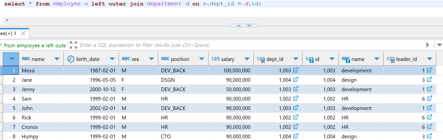 위의 예시는 부서 1003 에서 리더를 제외한 직원들의 연봉정보를 조회하는 쿼리문이다. 결과적으로 보여야하는 정보를 기준으로 employee 를 써주었고, department 테이블을 조인시켜주되, employee 를 기준으로 조인해주었다.