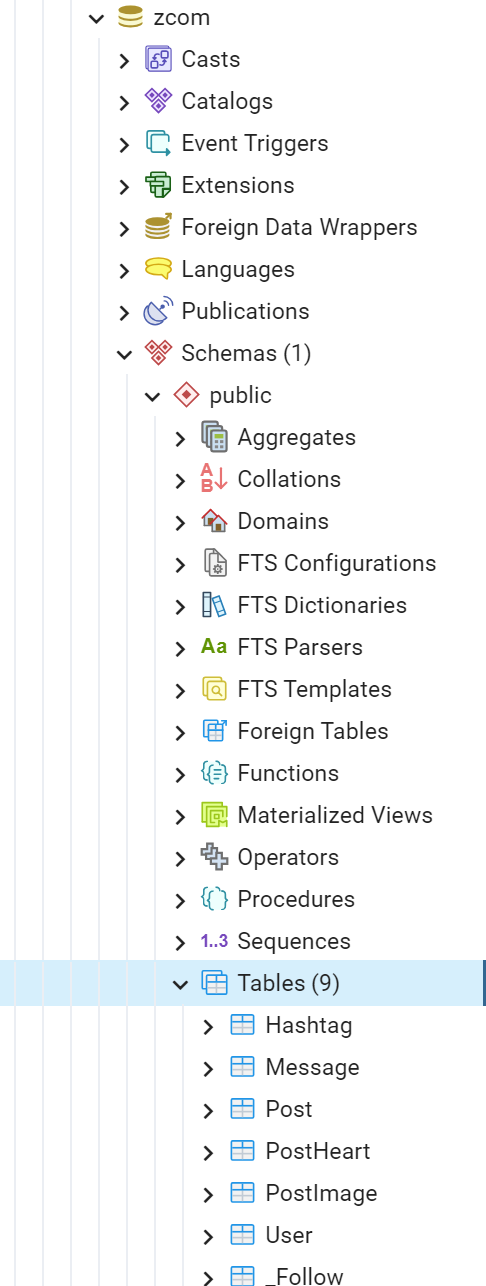 그런 다음 백엔드측 서버의 터미널 상에서 npx prisma migrate dev 를 실행해주면 됩니다. 이후 zcom db에 접근하여 Schemas > public > Tables 를 확인해보면 성공했다면 테이블들이 생겨남을 알 수 있습니다.