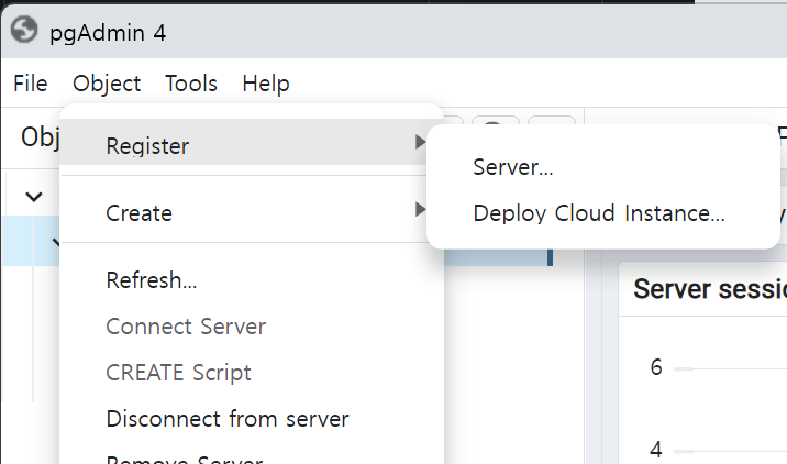 백엔드 서버를 연결해줘야 하므로 Object > Register > Server 로 접근합니다. 그전에 혹시 비밀번호를 묻는 창이 뜨면 기존에 PostgreSQL을 다운로드 받으실 때 지정해주신 postgres의 비밀번호를 입력해주면 됩니다.(MySQL의 root 계정이라 생각하면 됩니다)