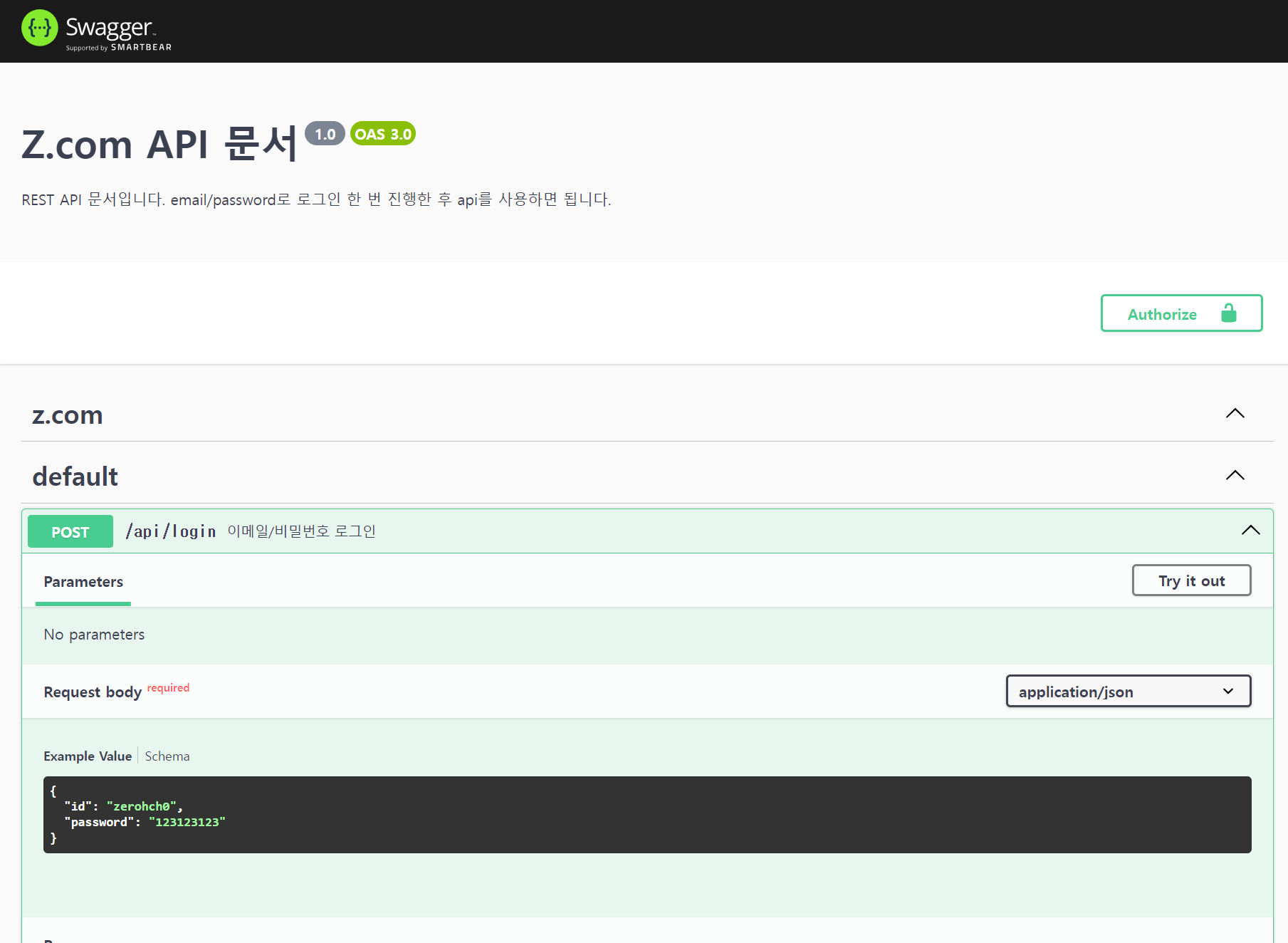 request body 안의 내용이 꼭 필요한 요소를 보여줍니다. application/json 형태로 id와 password를 body에 담아서 보내줘야 합니다.