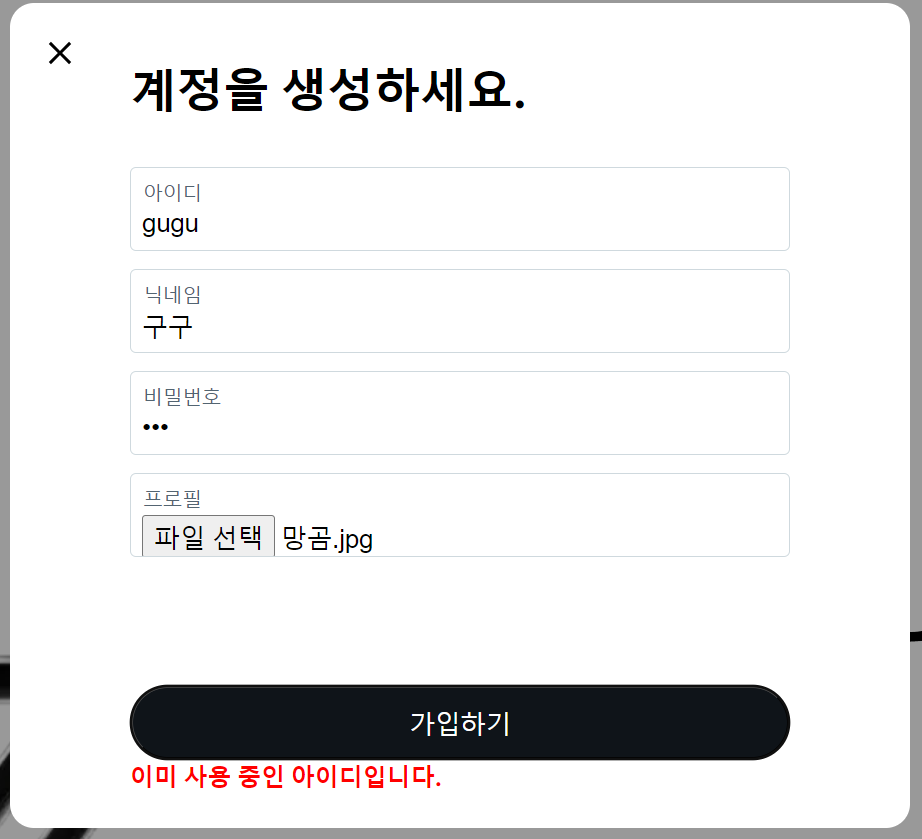 로그인 화면으로 돌아가서, 동일한 아이디와 비밀번호로 회원가입 진행 시 아래와 같은 화면을 볼 수 있습니다.