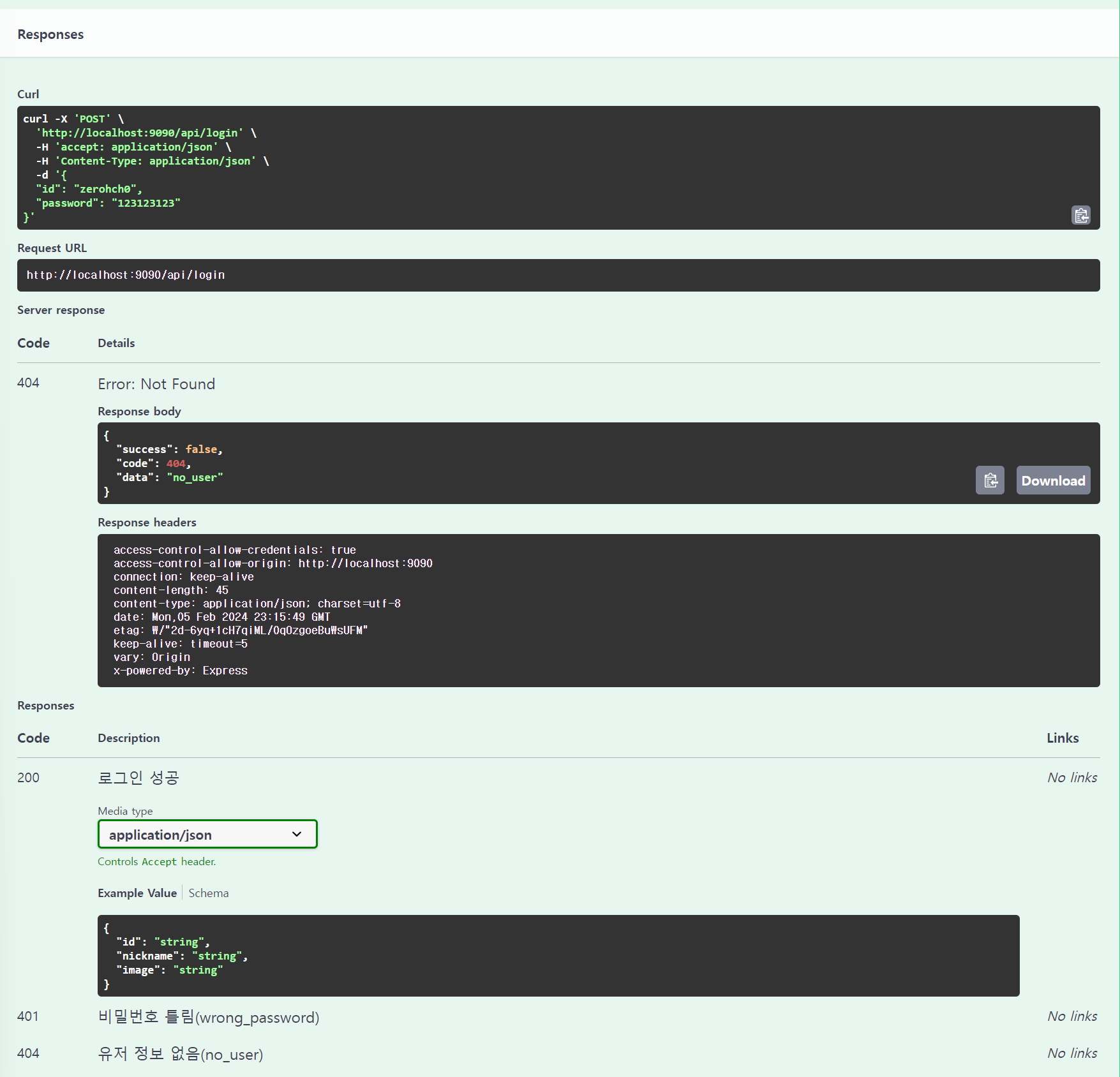 그 아래론 요청의 응답 내용과 서버 응답 코드가 명세되어 있습니다. 위의 내용을 보면 404, 200, 401 이렇게 존재함을 볼 수 있습니다. 응답 body 는 success 여부와 code 번호, data가 담겨서 옵니다.
