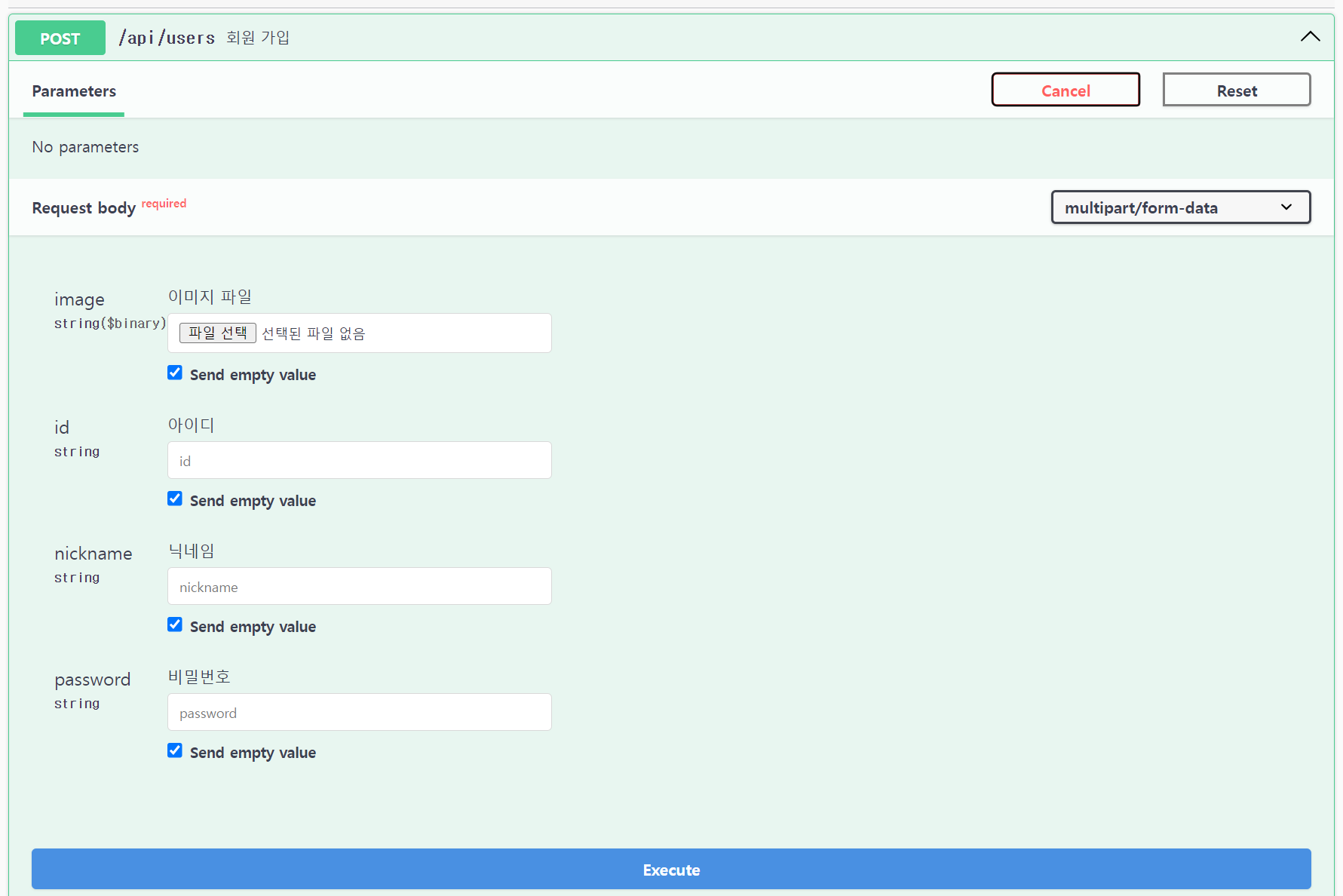 swagger 의 좋은 점 중 하나는 기존에는 postman 등을 사용하였지만 아래의 이미지처럼 Try it out 을 클릭해서 직접 테스팅을 해볼 수 있다는 점입니다.