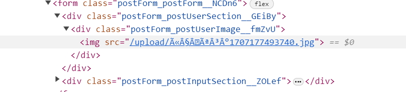 로그인을 해보면 PostForm 쪽의 프로필이 보이지 않음을 알 수 있습니다. 태그를 확인해보면 아래와 같이 src 부분에 /upload 폴더에 있다는 것을 확인할 수 있는데, 이 upload 폴더는 프론트엔드에만 존재하는 폴더입니다. 실제 이미지는 백엔드에 저장되어 있으니 당연하게도 이미지가 뜨지 않는 것입니다.
