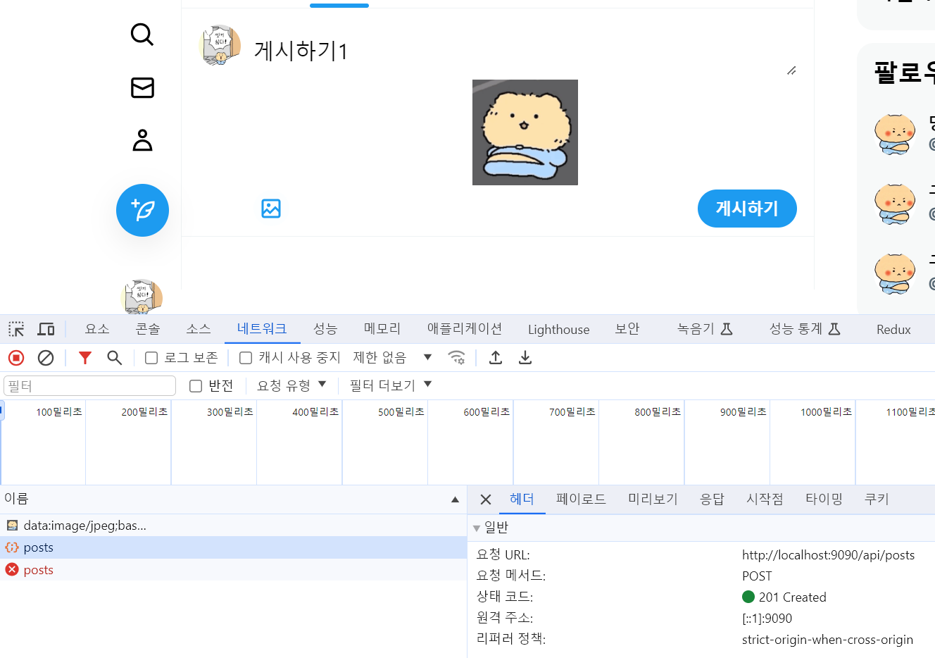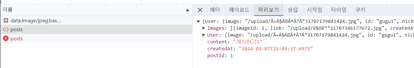 지금까지 구현한 내용을 바탕으로 요청이 제대로 들어가고 있음을 알 수 있습니다. 이제 게시하기 버튼을 누르면 -> PostForm 내용을 비워주고 -> 아래 게시글 목록에 채워주는 작업을 해야합니다.