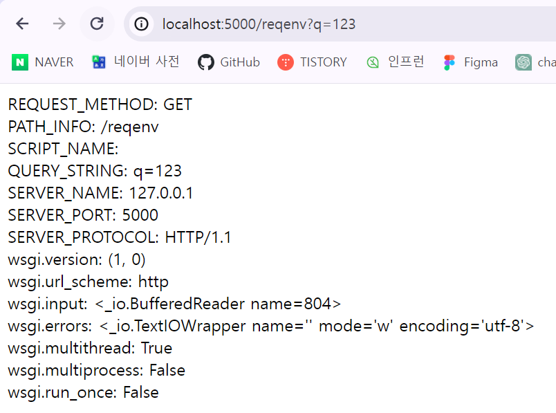 기본적으로 플라스크에 지정해주는 app은 WSGI 어플리케이션이다. 그럼 WSGI란 파이썬 표준으로 HTTP를 통하여 요청을 받아서 응답하는 어플리케이션의 명세를 만족시키는 객체, 클래스 등을 의미한다. 그리고 environ 과 start_response 를 매개변수로 받는다.