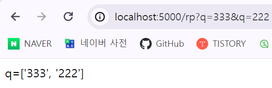 request.args.get() 으로 Get 요청 메서드의 쿼리스트링을 받아올 수 있다. 쿼리스트링은 주소창 ? 다음에 쓰이는 키=값 형태의 문자열이다. 예를 들어 아래처럼 쿼리스트링을 가져오면,