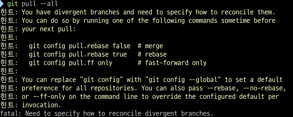 해당 오류는 pull 받을 때, 내 로컬에서 merge 과정 중 원격과 충돌이 일어난 것이고, merge 방식을 설정하라는 경고임