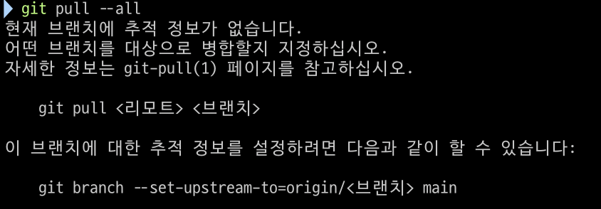 그 다음 git branch --set-upstream-to=origin/main main 로 브랜치 설정을 변경해준다.. 그럼 위 오류는 해결됨
