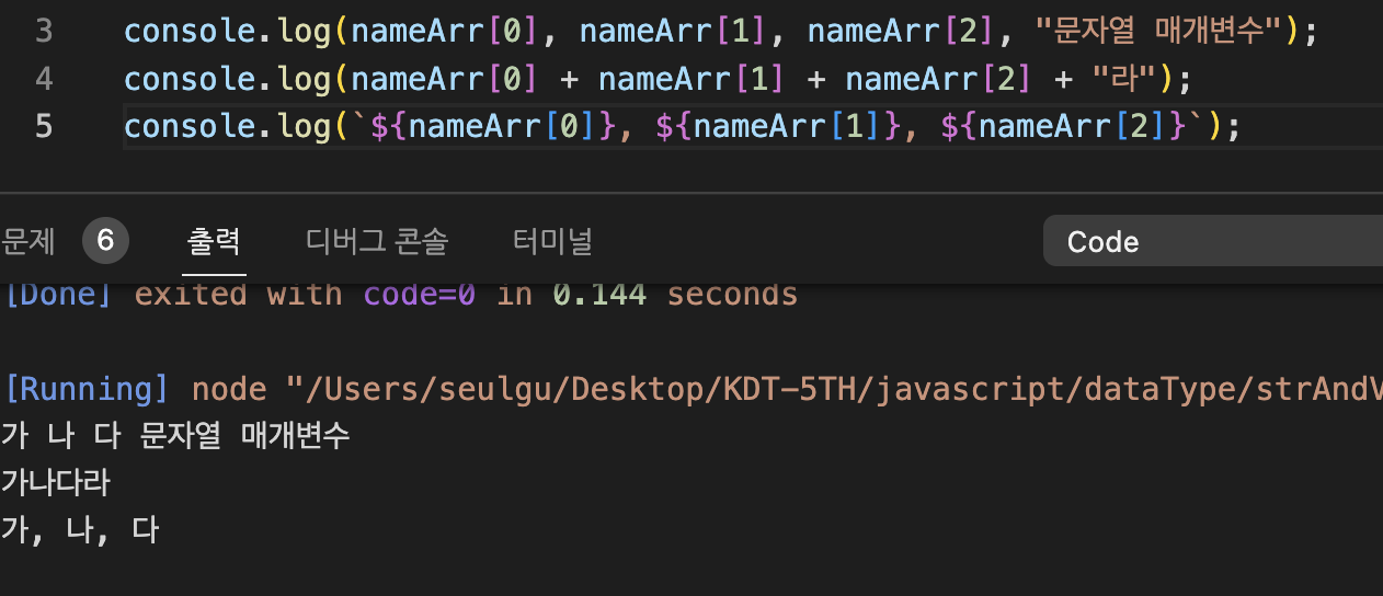 console.log("문자열", 변수, "문자열");