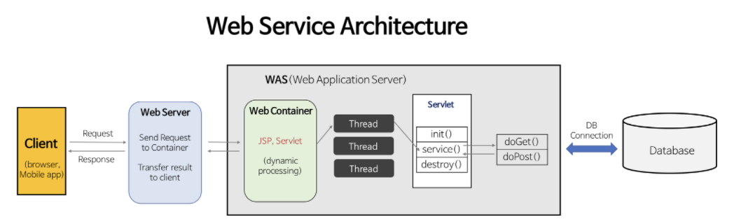 - WAS는 웹 컨테이너 혹은 서블릿 컨테이너라고도 불린다. WAS = 웹 서버+웹 컨테이너