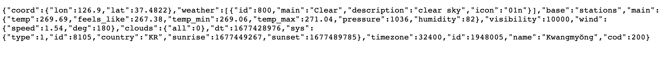 lat에는 위도를, lon에는 경도를 넣고 API key의 경우 위의 사이트에서 받는 키를 의미한다. 프로필에서 My API key를 복사!